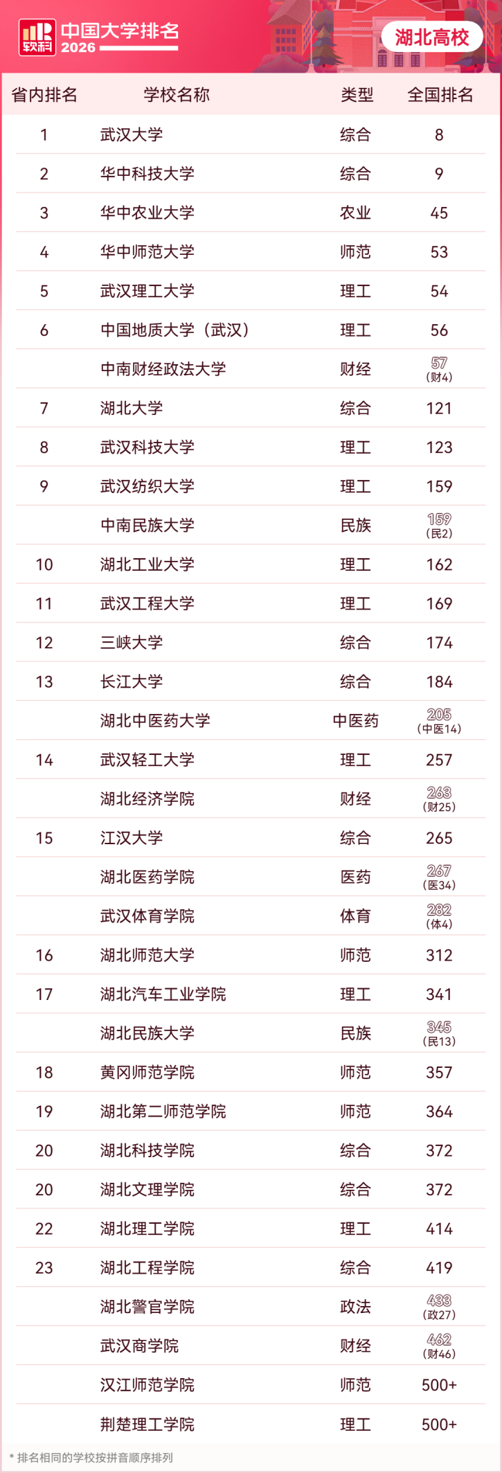 4月15日,高等教育专业评价机构软科发布“2026软科中国大学排名”,湖北高校表现亮眼,共有52所高校上榜,其中公办高校34所,民办高校18所。
