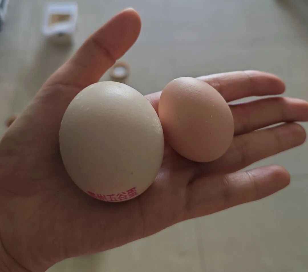 右边是阿怪的小鸡下的蛋,左边是市场买的鸡蛋对比