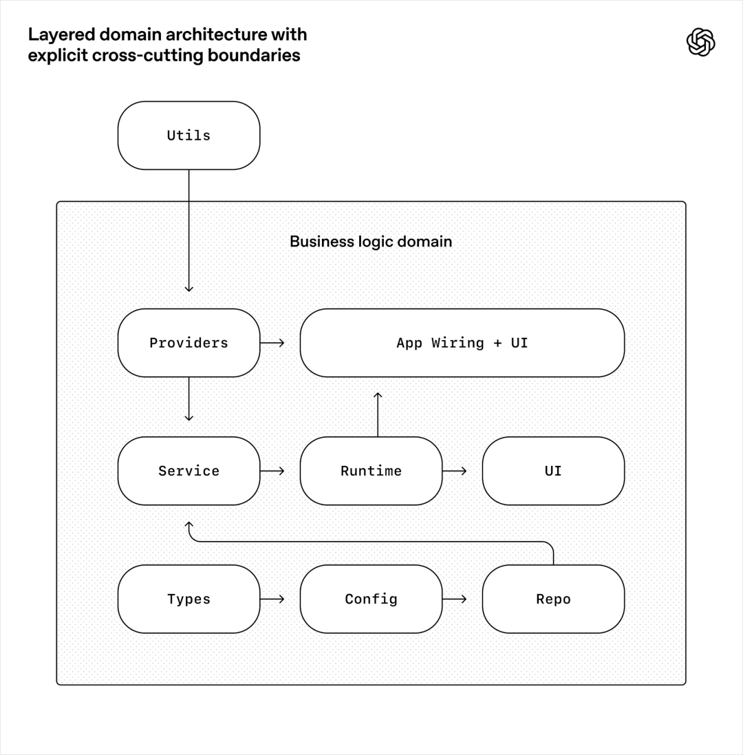 他们强制定义了一套分层架构,Types → Config → Repo → Service → Runtime → UI,六层,每一层只能依赖它下面的层,不能反向依赖。