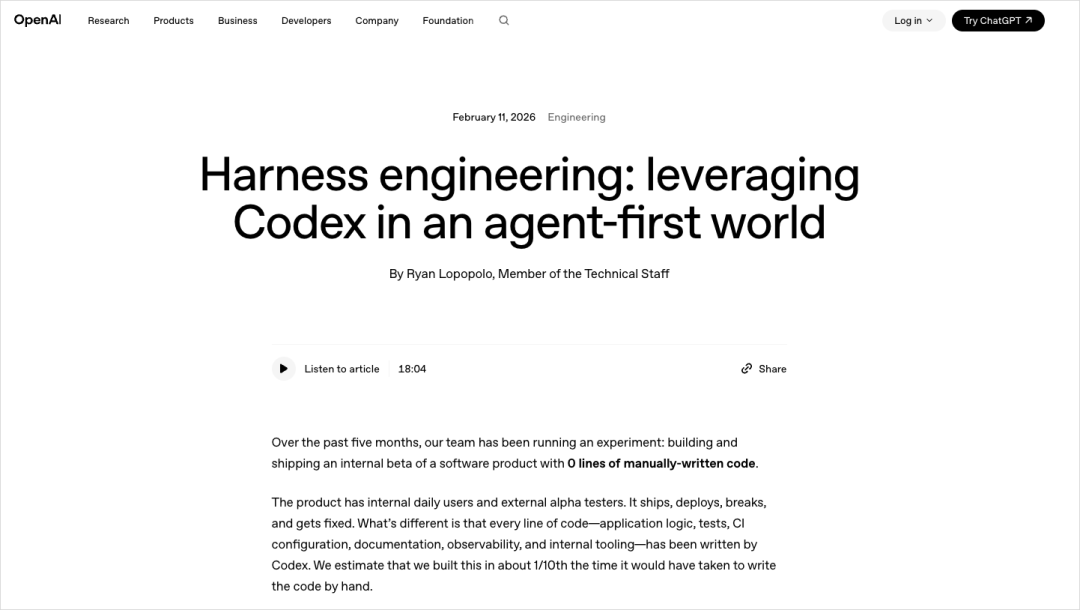 直到2026年2月,OpenAI的一篇Blog,把Harness Engineering写在了巨大的标题上,于是,Harness开始正式进入大众视野。