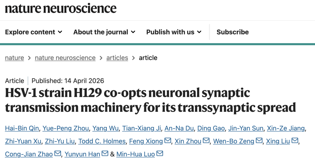 2026 年 4 月 14 日,中国科学院罗敏华研究员,华中科技大学同济医学院韩芸耘教授,重庆邮电大学赵从健研究员,深圳大学医学部刘星教授,中国科学院曾文波研究员,中国科学院精密测量科学与技术创新研究院周欣研究员、熊峰作为共同通讯作者,在 Nature 子刊 Nature Neuroscience 上发表了题为:HSV-1 strain H129 co-opts neuronal synaptic transmission machinery for its transsynaptic spread 的研究论文。