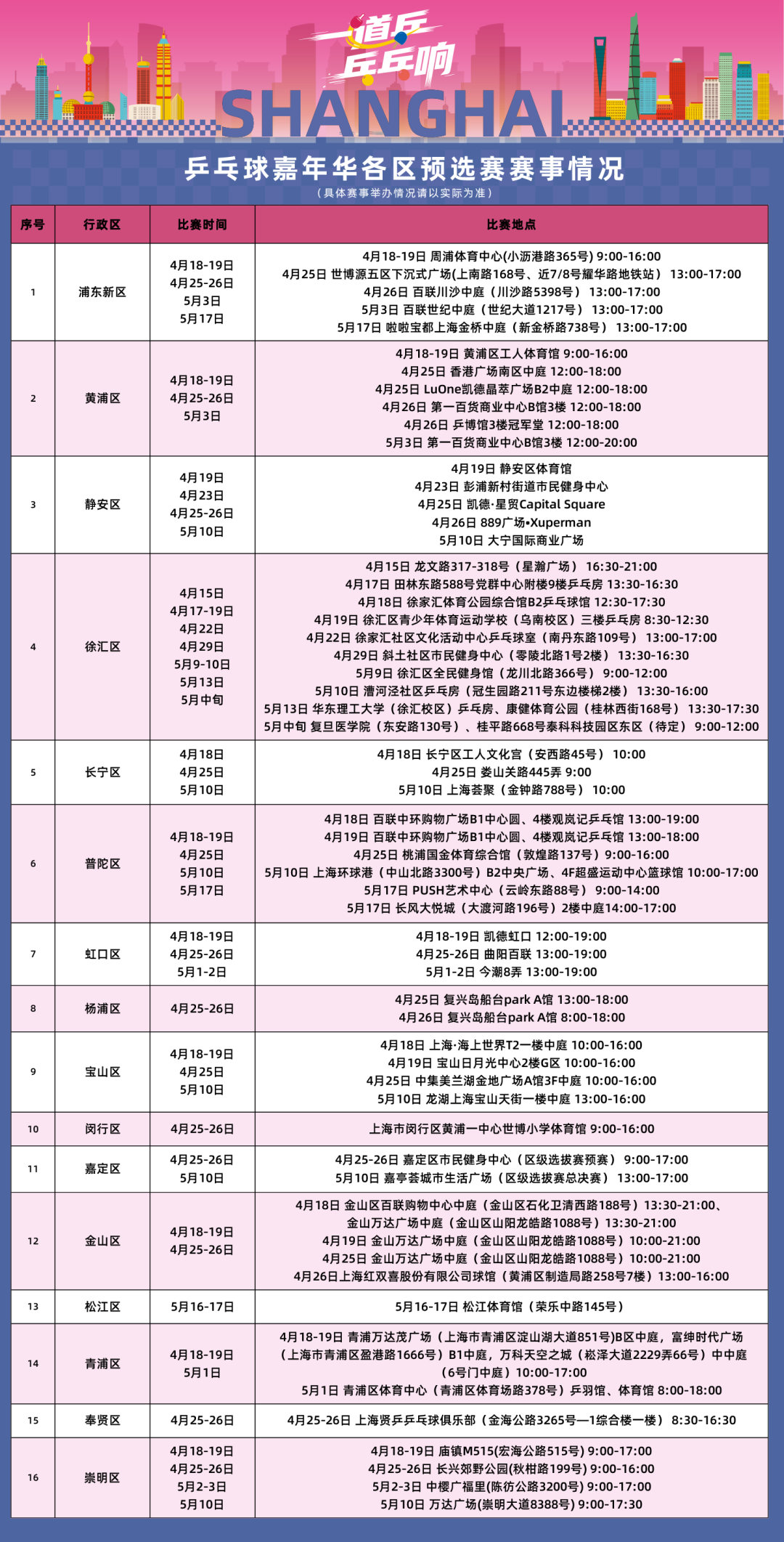各区预选赛详情来了,快来看看你身边有哪些吧~让我们一起加入这场全城乒乓盛会,“一道乒 乓乓响”!