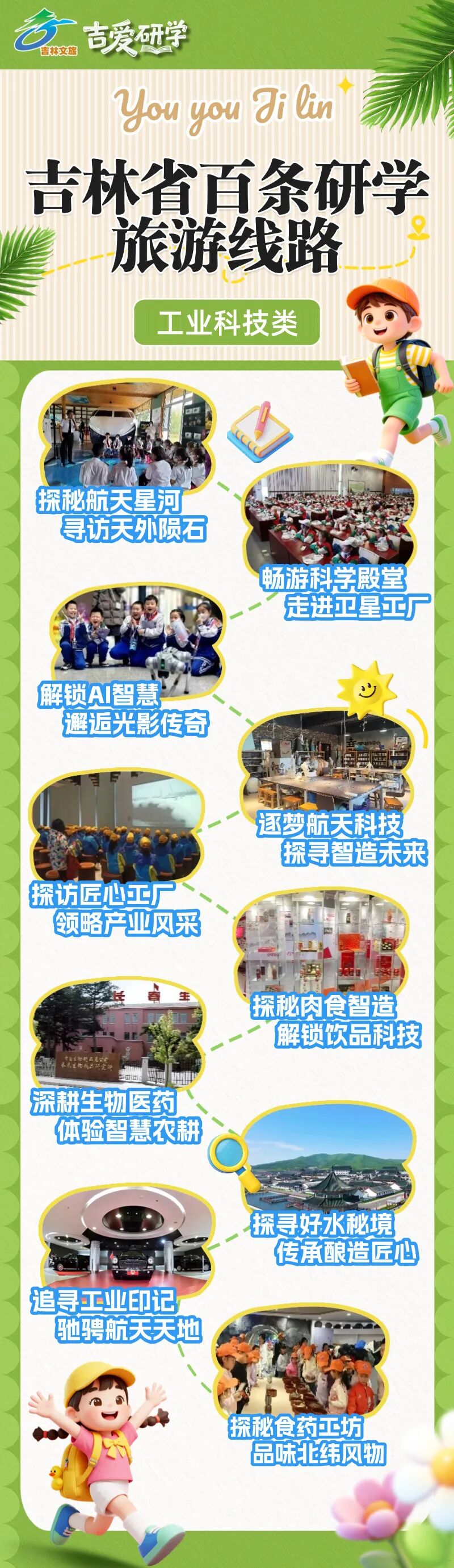 线路:长春市(长光卫星航天科普教育基地、筑梦星辰航天科教文旅馆、净月潭卫星观测站、慢山里营地综合体、吉林省科技文化中心)→ 吉林市(吉林市博物馆陨石雨陈列、桦甸市名峰小蚂蚁研学旅行基地)