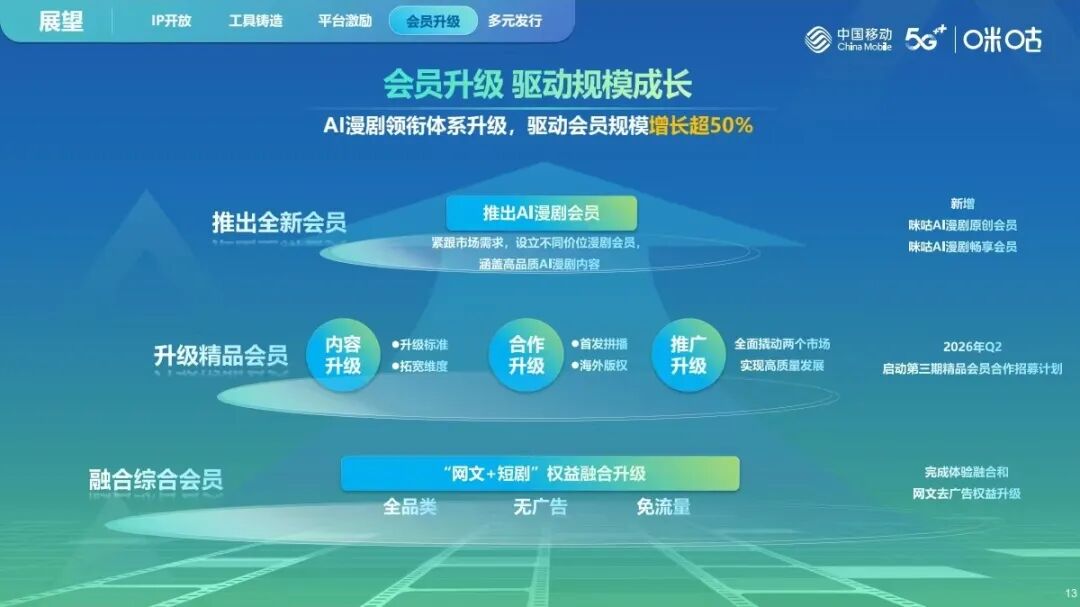 咪咕对会员权益进行全面升级,深度融合“网文+短剧”核心权益,升级网文订阅会员无广告权限,实现全品类内容免流量、无广告沉浸式体验。同时全新推出AI漫剧会员,采用分层定价满足不同用户需求,力争26年实现会员规模增长50%以上。