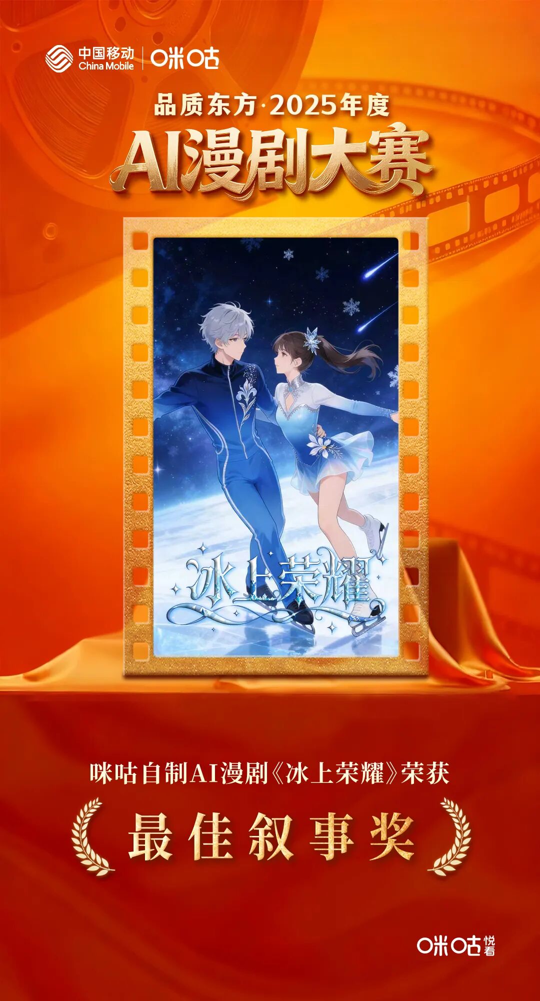 在IP扶持层面,咪咕短剧于2025年11月推出首届“咪咕杯”AI漫剧创作大赛,以百万奖金、流量扶持、长期合作及保底制作费,全方位赋能创作者。其中参赛作品《冰上荣耀》斩获“品质东方・2025年度AI漫剧大赛最佳叙事奖”,成为IP+AI漫剧精品化的标杆案例。依托这一模式,咪咕紧跟体育赛事热点,现已开启世界杯足球主题征稿活动,目前正在火热进行中。