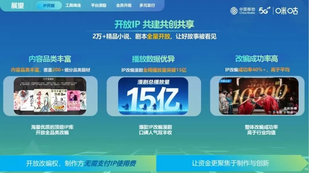 咪咕以开放IP+免费工具+全球发行的模式,打破平台间的封闭竞争,推动行业走向开放协同、共建共享,让创作者、平台、IP方实现多方共赢,为整个行业注入长期可持续的发展动力。