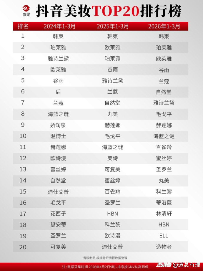 根据2026年3月抖音美妆TOP20榜单,国货主导的格局愈发明确,不仅上榜数量远超外资品牌,且前4强均是国货品牌,这也是近3年的3月抖音美妆榜中首次出现的格局。另外根据青眼梳理的2026年一季度(1—3月)榜单,上榜的国货品牌数量为13个,占比高达65%,这些品牌过去5年都在抖音迎来了快速增长。