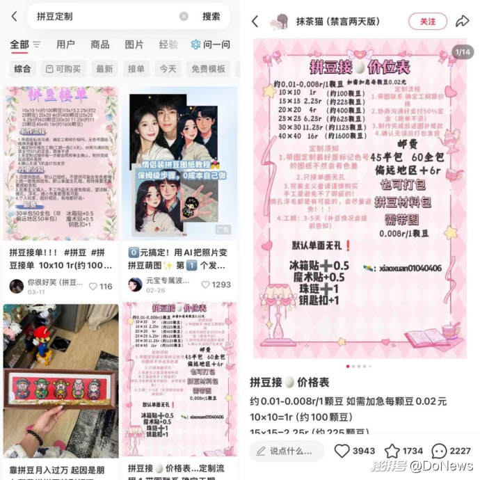 “做定制很耗时间,”小红书博主“豆豆酱”告诉DoNews:“一个中等复杂度的作品可能要拼七八个小时,但利润空间比卖材料包大得多,而且客户粘性很强,很多人会反复下单。”