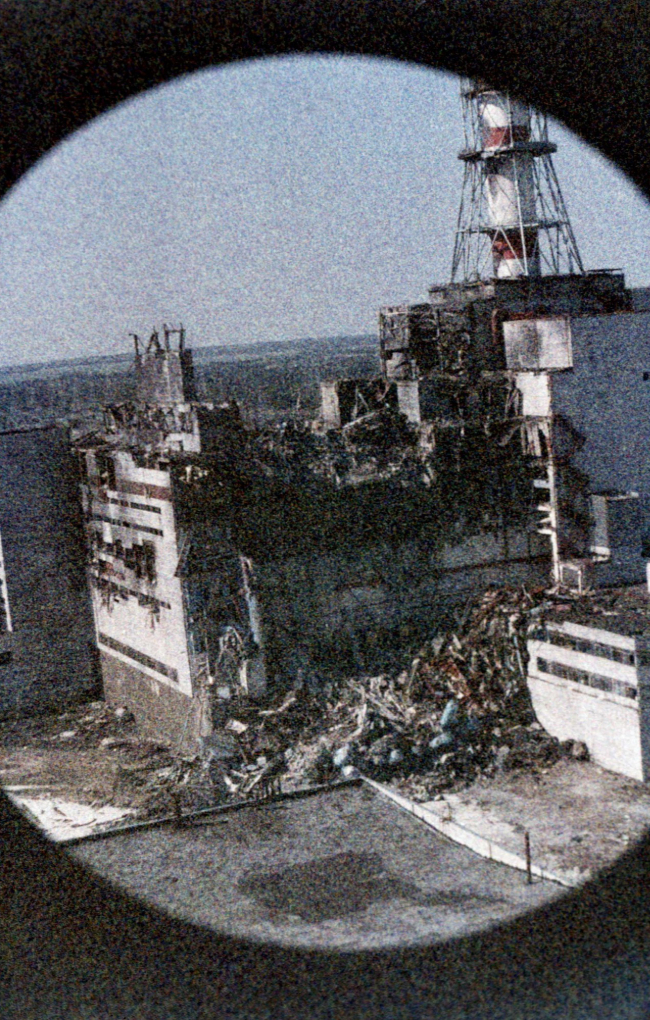1986年4月26日,摄影师阿纳托利·拉斯卡佐夫在爆炸后几个小时内拍摄的被摧毁的四号反应堆。照片中可以看到高放射性蒸汽从反应堆核心喷出。