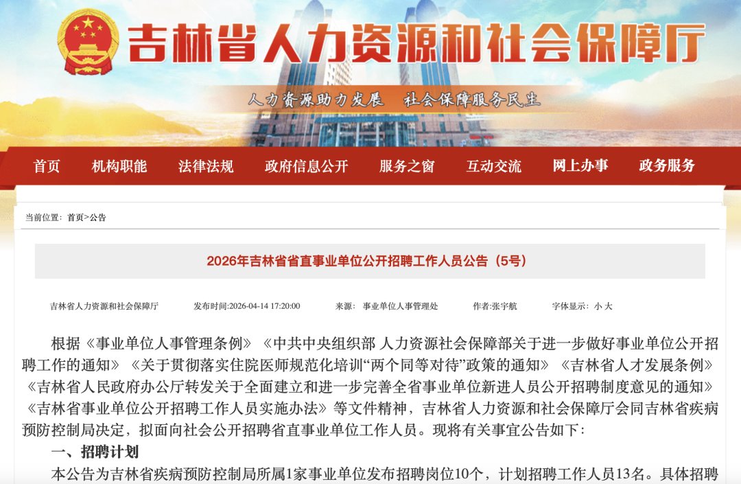 4月14日,吉林省人力资源和社会保障厅网站发布2026年吉林省省直事业单位公开招聘工作人员公告(5号),详情如下: