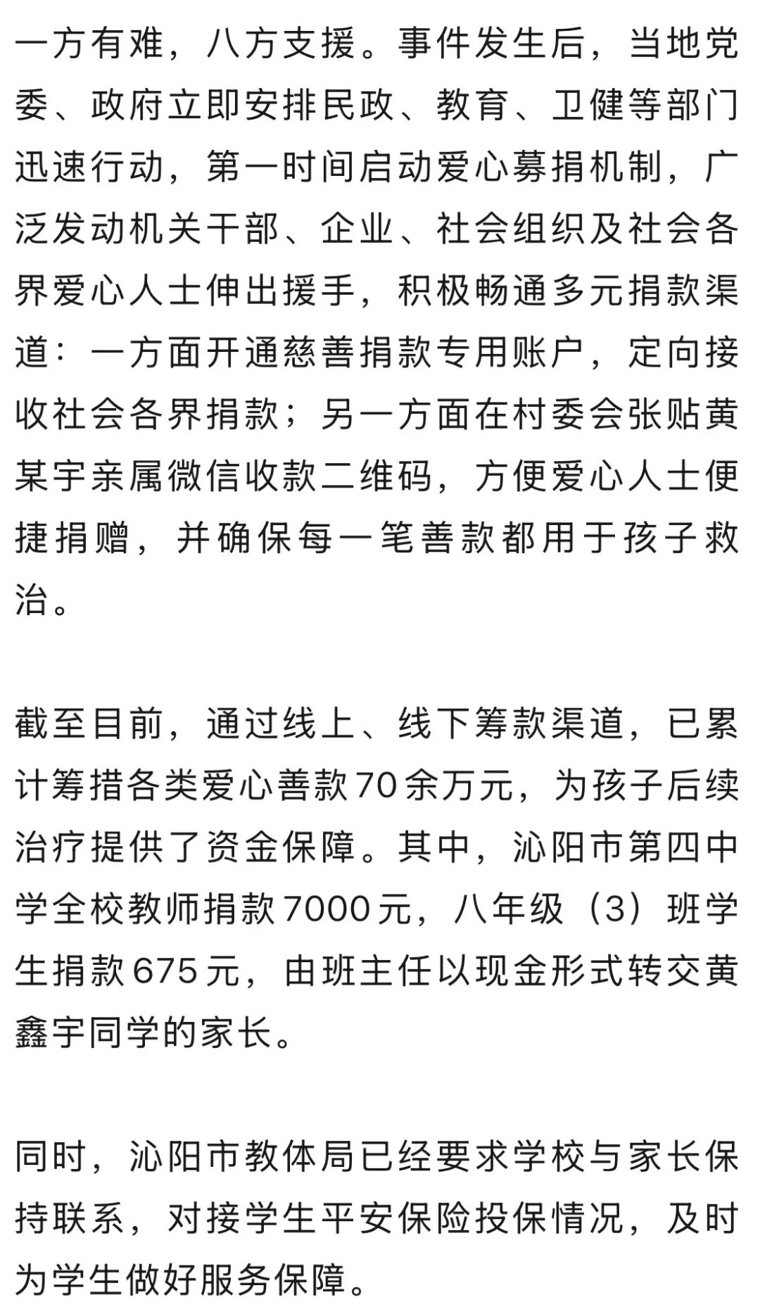 事发后,当地党委、政府高度重视、快速响应,统筹各方力量全力以赴开展医疗救治、帮扶救助与事件处置工作。为争取最佳治疗效果,4月12日,黄鑫宇已顺利转入北京市儿童医院重症监护室,目前生命体征平稳。4月 13日,北京市儿童医院组织多学科专家会诊,精准研判病情,制定下一步专项治疗方案。焦作、沁阳两级卫健部门工作人员,镇、村工作人员,已赶赴北京市儿童医院,帮助家属做好医院对接等工作,助力孩子康复。
