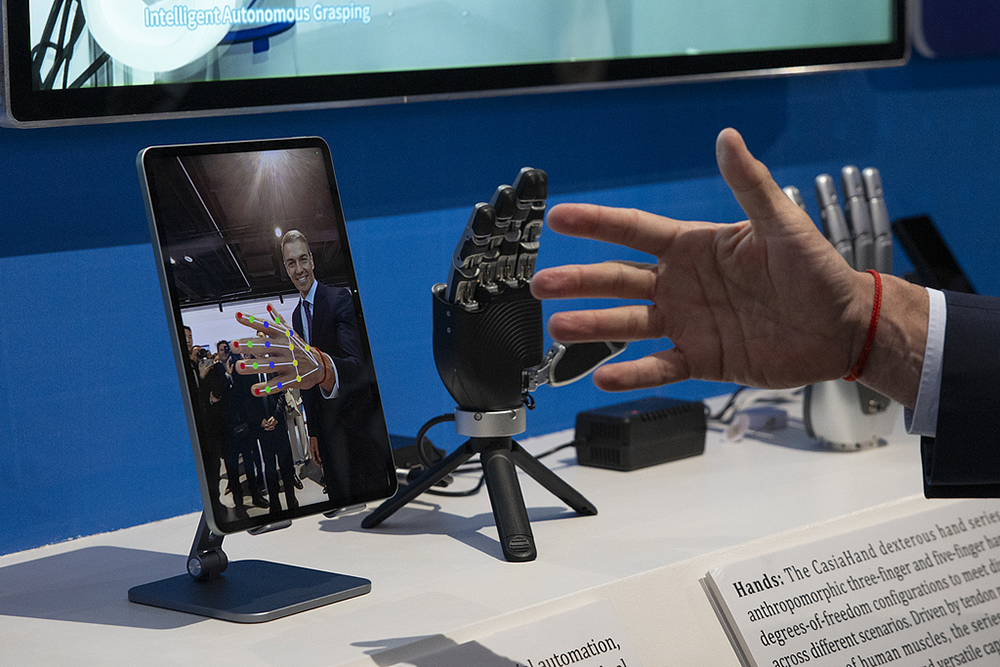 2026年4月13日,北京,西班牙首相佩德罗·桑切斯在访问中国科学院大学期间查看机械臂。视觉中国 图