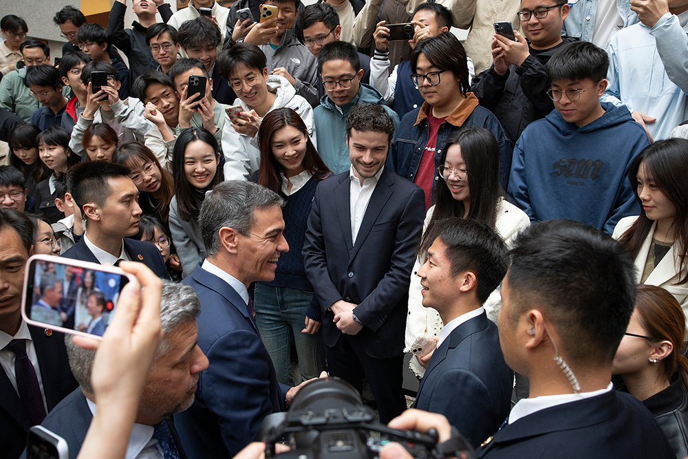 2026年4月13日,北京清华大学,西班牙首相佩德罗·桑切斯在合影后与学生交谈。视觉中国 图