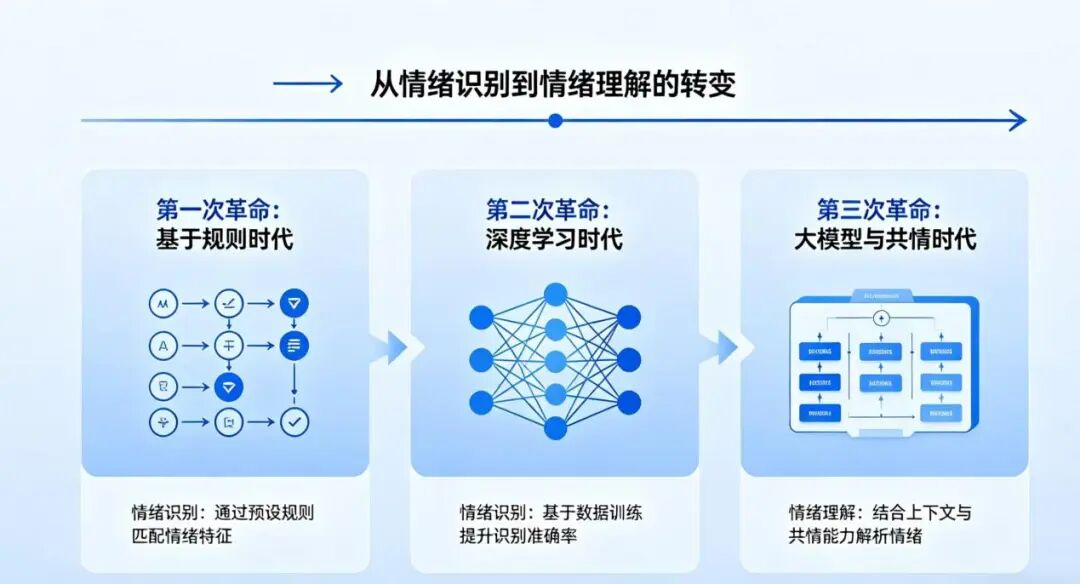 任福继把过去三十年概括为三次革命:规则时代、深度学习时代、大模型时代。最初是规则时代——研究者手工搭建情感识别的逻辑框架,像搭积木一样,一块一块把“人在什么情况下会有什么情绪”写进代码,费力,且很容易被现实打脸。后来深度学习来了,机器开始自己从海量数据里找规律,情感识别的准确率大幅提升,多模态融合第一次成为可能。但这两个阶段有一个共同的天花板:机器只能告诉你“这个人现在是什么情绪”,却说不清楚“为什么”。