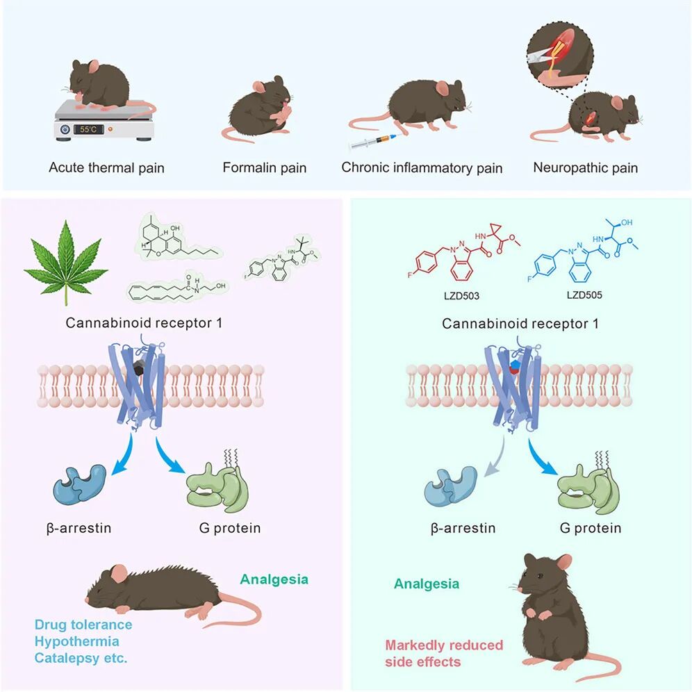大麻素1型受体(CB1)是中枢神经系统中表达最丰富的G蛋白偶联受体(GPCR)之一,也是开发下一代非阿片类镇痛药的明星靶点。其激活后可同时抑制疼痛信号的上行传递并增强下行抑制,从而产生强效镇痛作用。然而,传统CB1激动剂在发挥镇痛作用的同时,会不加选择地激活所有下游信号通路,导致运动协调障碍、体温降低、成瘾性及耐受等一系列严重不良反应。这种“伤敌一千,自损八百”的效应,如同无法分离的“双刃剑”,长期阻碍了CB1靶向药物的临床应用。