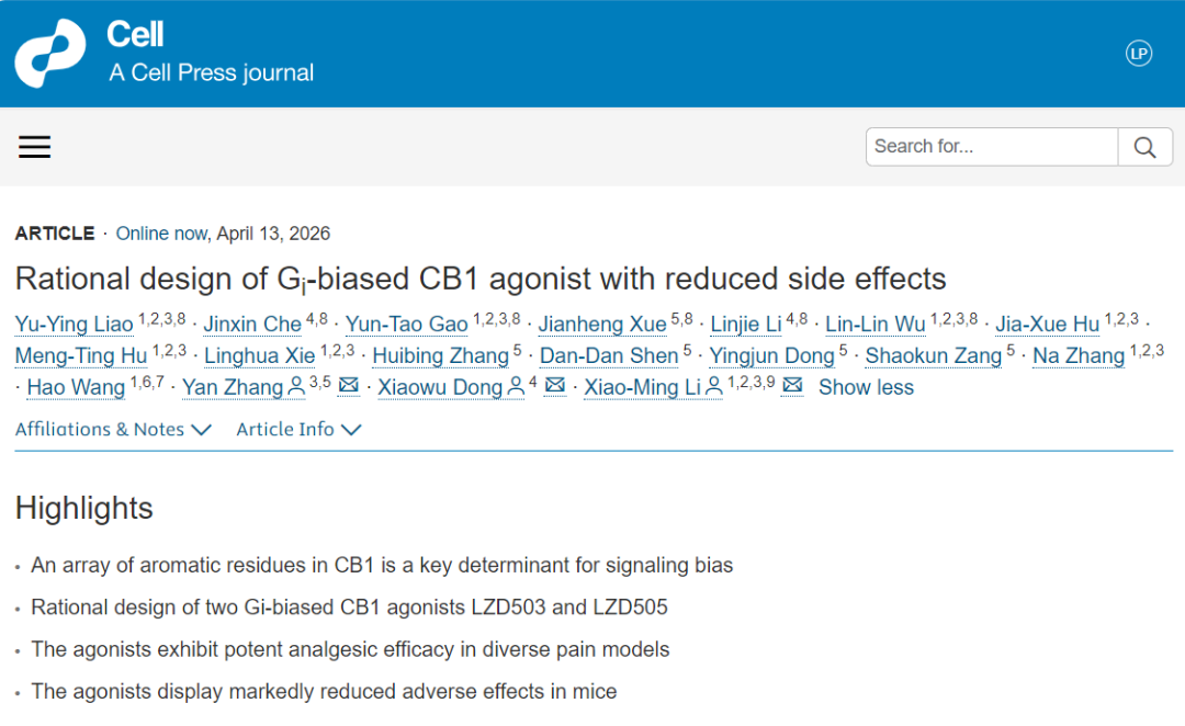 近日,浙江大学李晓明/董晓武/张岩团队在国际顶级学术期刊《Cell》发表最新研究成果:通过高分辨率结构解析与理性药物设计,成功开发出两种具有Gi蛋白信号偏向性的大麻素1型受体(CB1)激动剂——LZD503和LZD505。在小鼠模型中,这两种新型化合物实现了高效镇痛与低副作用的分离,为开发安全、精准的非阿片类镇痛药物开辟了全新路径。