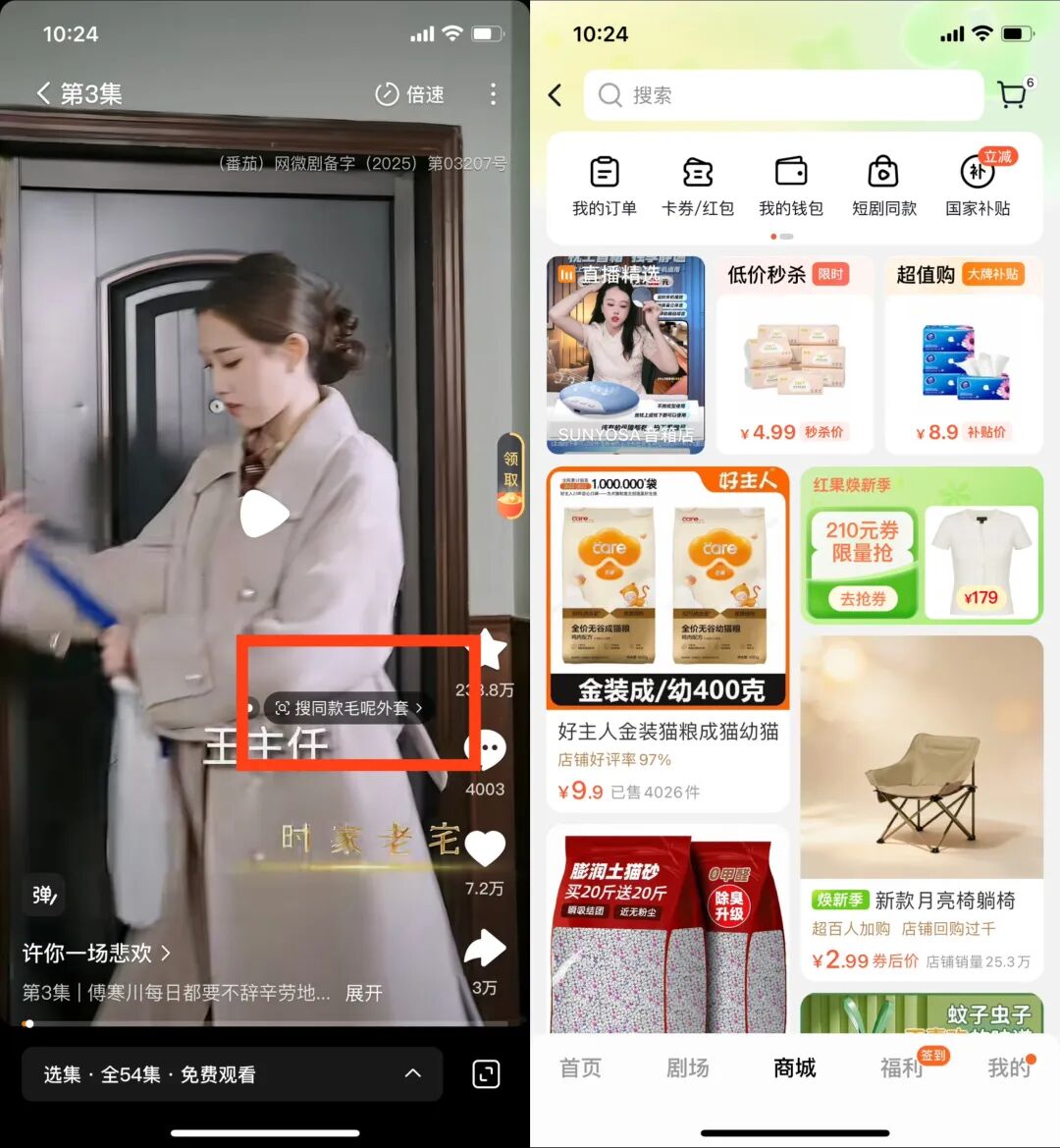 左:短剧内搜同款;右:红果短剧商城