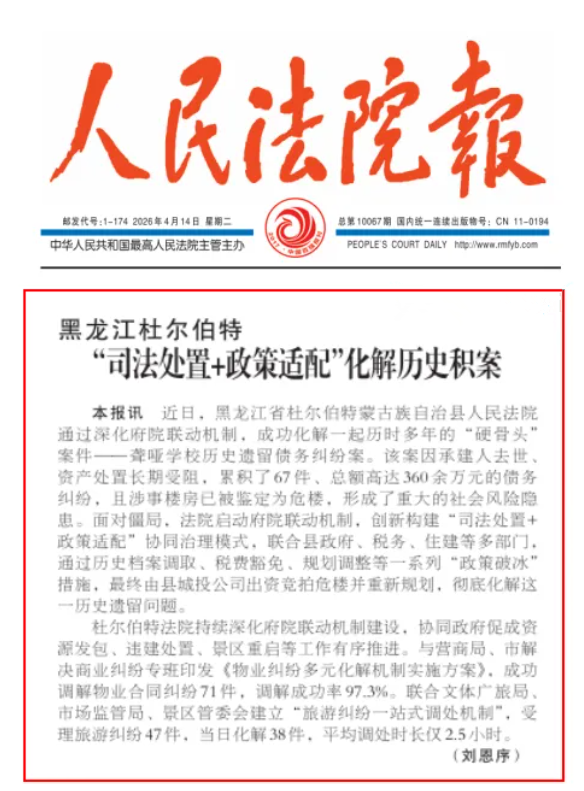 原标题:《《人民法院报》 | 黑龙江杜尔伯特 “司法处置+政策适配”化解历史积案》