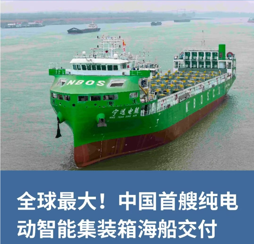 4月15日,中国首艘、世界最大740TEU纯电动智能集装箱海船“宁远电鲲”号圆满完成各项试验,正式交付启航。该船由中船集团上海船舶研究设计院自主研发设计、中船集团第七〇四研究所提供新型纯电推进系统,以零碳、智能、高效三大突破,开启我国沿海集装箱运输绿色转型新篇章。