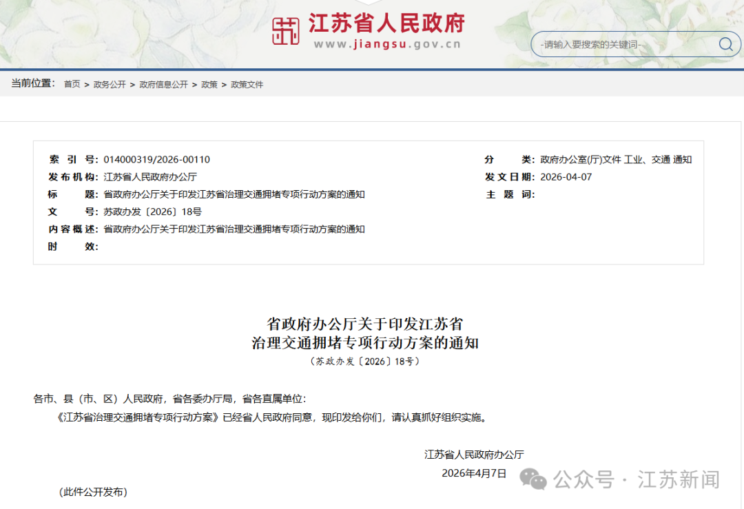 江苏省政府近日正式印发《江苏省治理交通拥堵专项行动方案》,以5年为周期,打出治堵“组合拳”,力争通过5年努力,全省交通拥堵状况明显改善,各设区市交通运行主要指标位居全国同类城市前列;安全风险显著下降,道路安全风险隐患整改率达100%;人民群众更加满意,总体评价满意度明显提升。