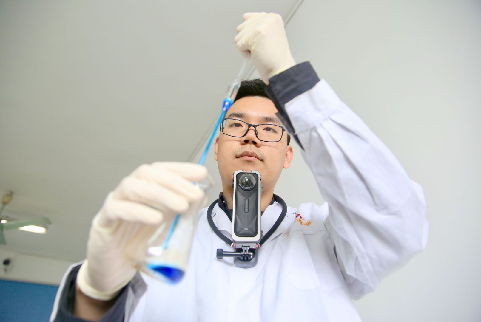 ▲曹立丰在实验室做检测,用运动相机记录工作状态。他的另一个身份是自媒体博主。
