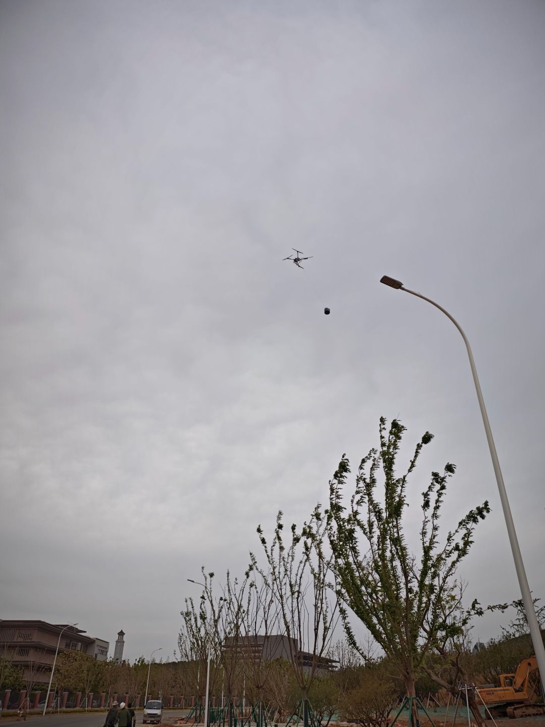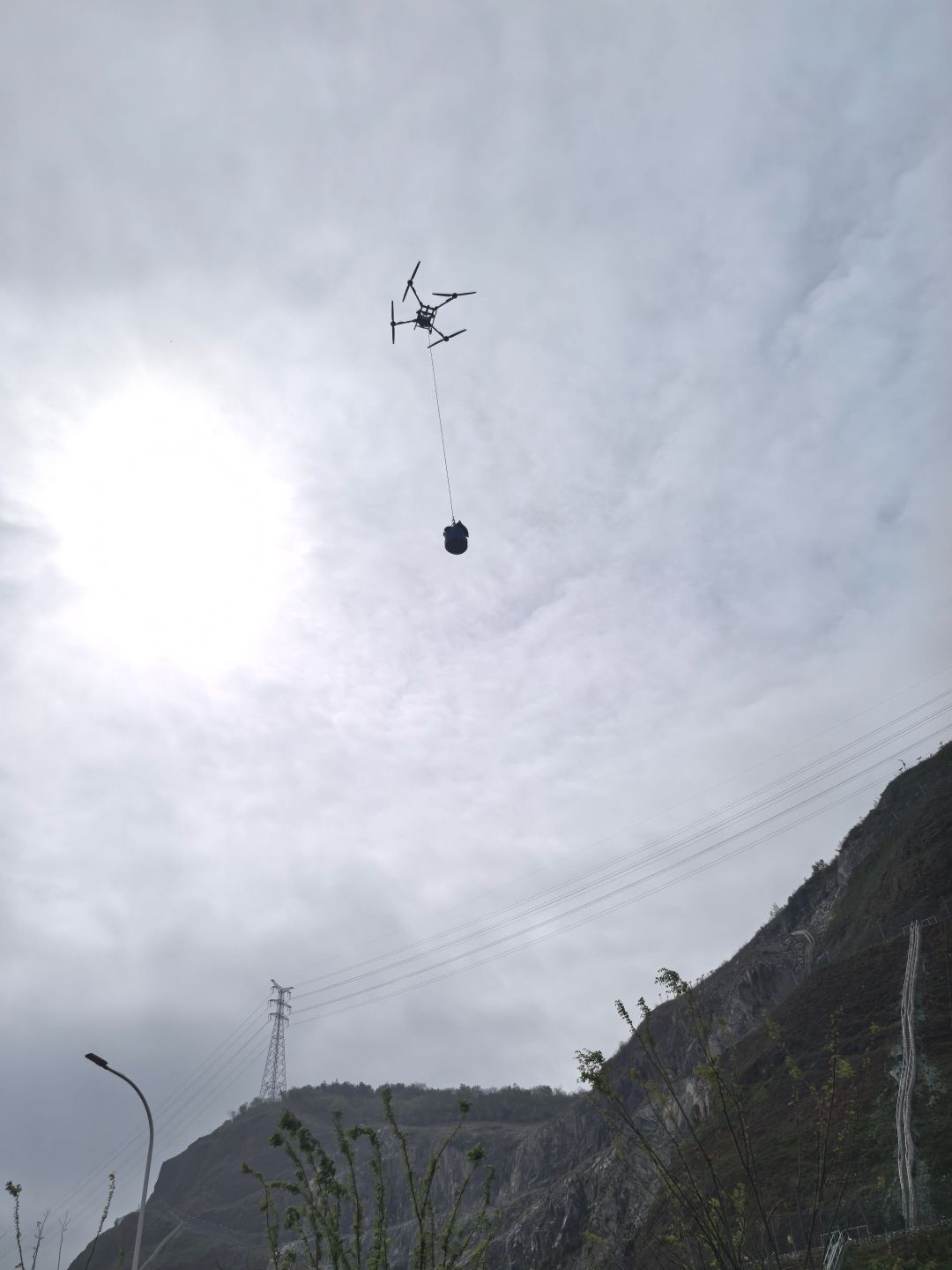这也是该项目首次引入无人机作业。一旁的无人机操作员张江奎告诉记者:“一次最多吊运100公斤,一天可以来回飞130多趟。”他还准备了车载发电机和备用电池,确保作业流程不中断。