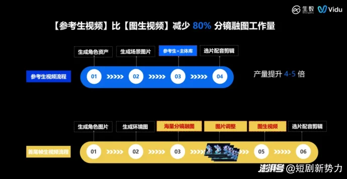 与传统“图生视频”需要经历“生成角色图→生成环境图→海量分镜融图→图生视频”的六步线性流程不同,“参考生视频模式”构建了“生成角色资产→生成场景图片→参考生+主体库→选片配音剪辑”的四步闭环。其核心优势在于: