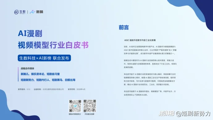 作为AI漫剧视频模型领域的专项白皮书,本次生数科技发布的《AI漫剧视频模型行业白皮书V1.0》,不仅梳理了行业发展规律、拆解了核心痛点,更输出了可落地的生产模式、组织转型方案与技术体系,为全行业参与者提供了清晰的实践参考,将有效推动AI漫剧行业摆脱分散式生产困境,加速工业化、精品化进程。