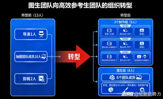 - 转型后架构:拆分为3个标准化制作组(9人)+1个专项支撑图生组(6人),形成“多线并行、高效协同”的工业化生产单元;