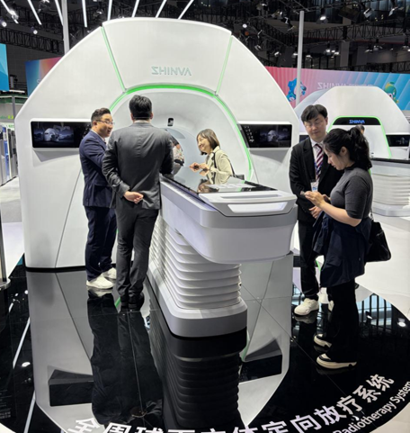 新华医疗在第93届CMEF现场发布的全周球面立体定向放疗系统。
