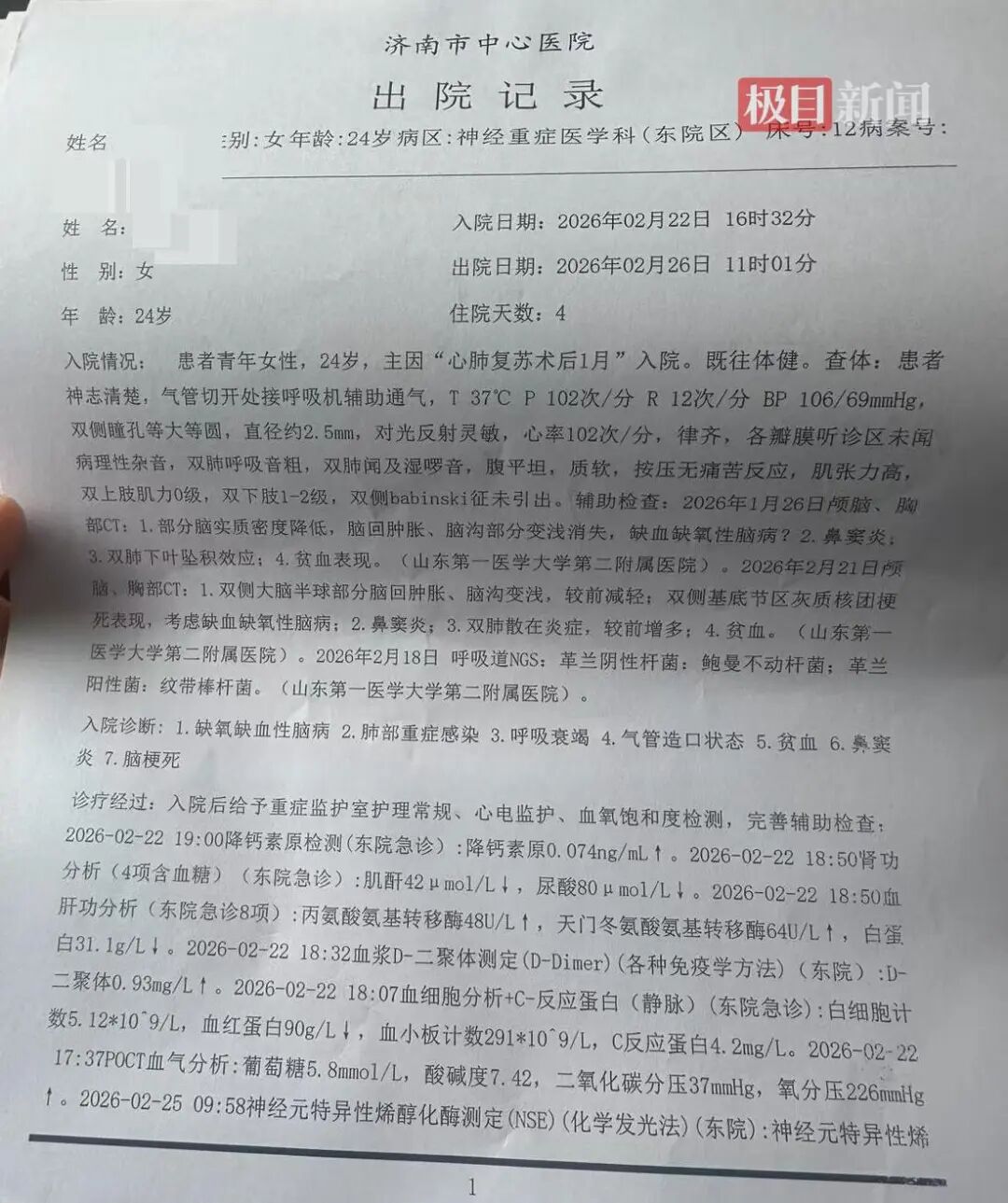 根据张先生提供的资料,山东第一医科大学第二附属医院急诊病历显示,1月21日16时24分,患者于半小时余前在外输液时突发呼之不应,后被送入该院急诊医学科就诊。另据济南市中心医院出院记录,入院诊断为缺氧缺血性脑病、肺部重症感染、呼吸衰竭、脑梗死等。