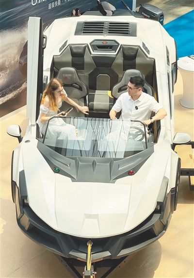 俄罗斯主播在展馆内体验一艘国产超跑游艇。王程龙 摄