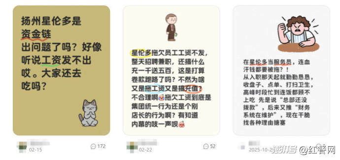 实际上,星伦多多个城市门店暂停营业并非无迹可寻。红餐网留意到,早在去年底,多地就陆续传出星伦多部分门店因拖欠房租、物业费被清退的消息。与此同时,社交平台上也开始集中出现员工讨薪、反映工资被拖欠的声音。