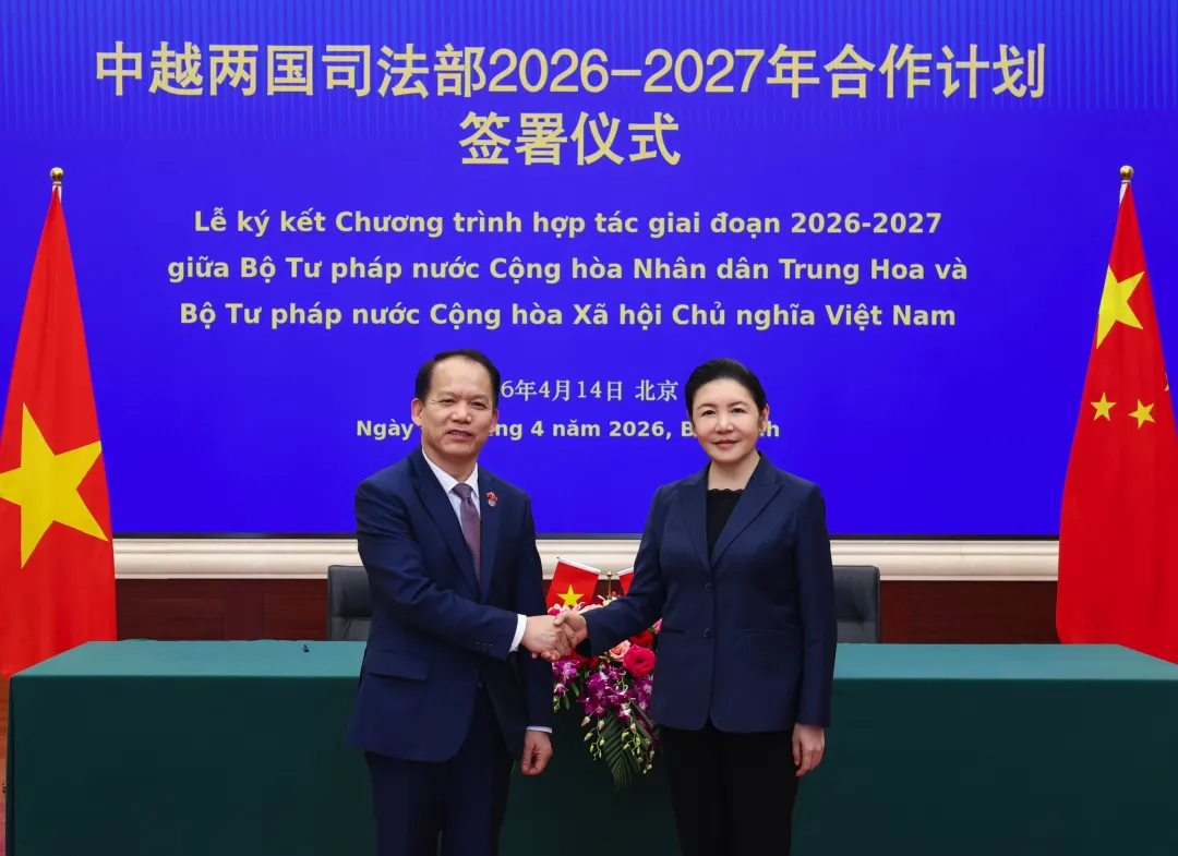 4月14日,司法部部长贺荣在京会见越南司法部部长黄青松一行。双方就健全边境边民民商事纠纷解决机制,深化律师、公证、法治宣传教育、人才培养等方面合作进行了务实深入交流,并签署了《中华人民共和国司法部与越南社会主义共和国司法部2026-2027年合作计划》。