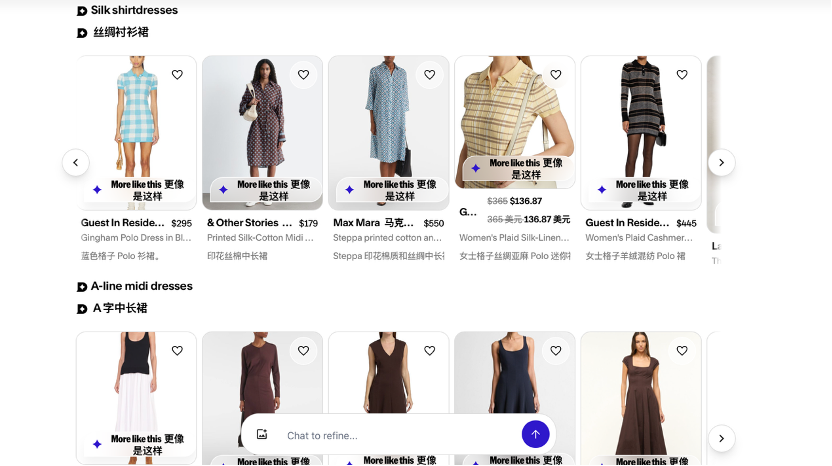 在C端,AI技术公司察觉到人们利用AI搭配服饰的使用场景,推出对话式购物体验,提供个性化造型建议。由电商资深从业者创办的Daydream种子轮即拿下5000万美元融资,在2025年6月上线。用户只需输入类似"我想要一条去巴黎参加婚礼的裙子"这样的自然语言,便能检索到匹配的商品。