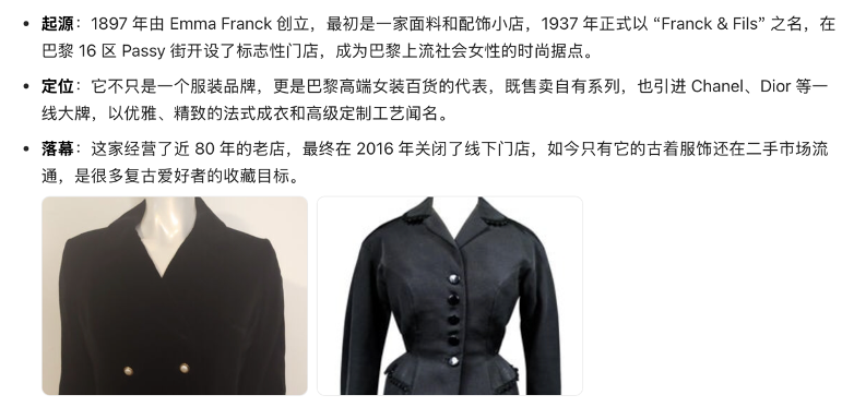 Gemini还进行了一次毫无必要的自圆其说。因为我并未告知Gemini这是在古着店里淘到的,于是它把15欧的吊牌误认成了150欧,并以此为据印证Franck &Fils属于高端品牌。