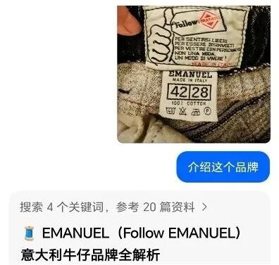 这位地板级买手的得意之作是一条意大利牛仔裤,标签上带着有趣的拳头标语,AI将其识别为意大利本土复古牛仔品牌EMANUEL,是牛仔黄金时代(80-90年代)的代表品牌之一。