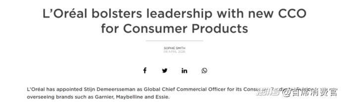 近日,据报道,欧莱雅集团宣布任命Stijn Demeersseman为消费品部门(即大众化妆品部门)全球首席商务官(COO),负责管理卡尼尔、美宝莲、Essie等品牌。