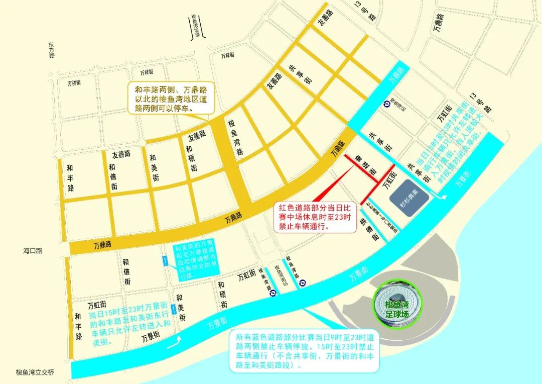 上述路段(不含共享街、万景街的和丰路至和美街路段)当日15时至23时,禁止车辆通行;共享街南行车辆只允许左转进入万景街,当人流较大时视情封闭共享街;万景街的和丰路至和美街路段东行车辆只允许左转进入和美街。