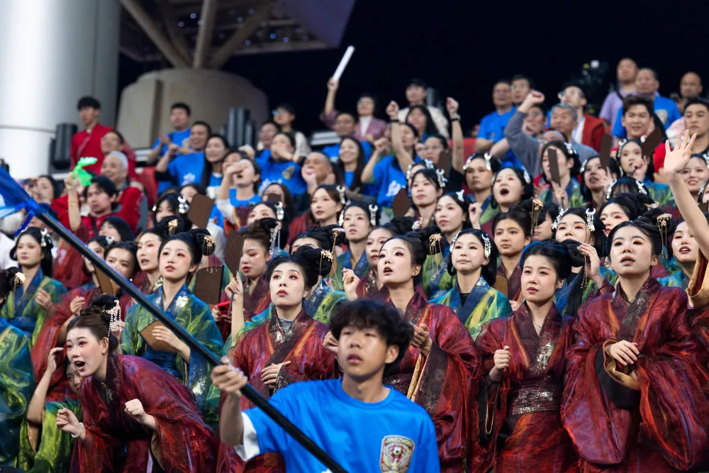 身着战国袍的荆州队球迷在看台上为球队加油助威。新华社记者 伍志尊 摄