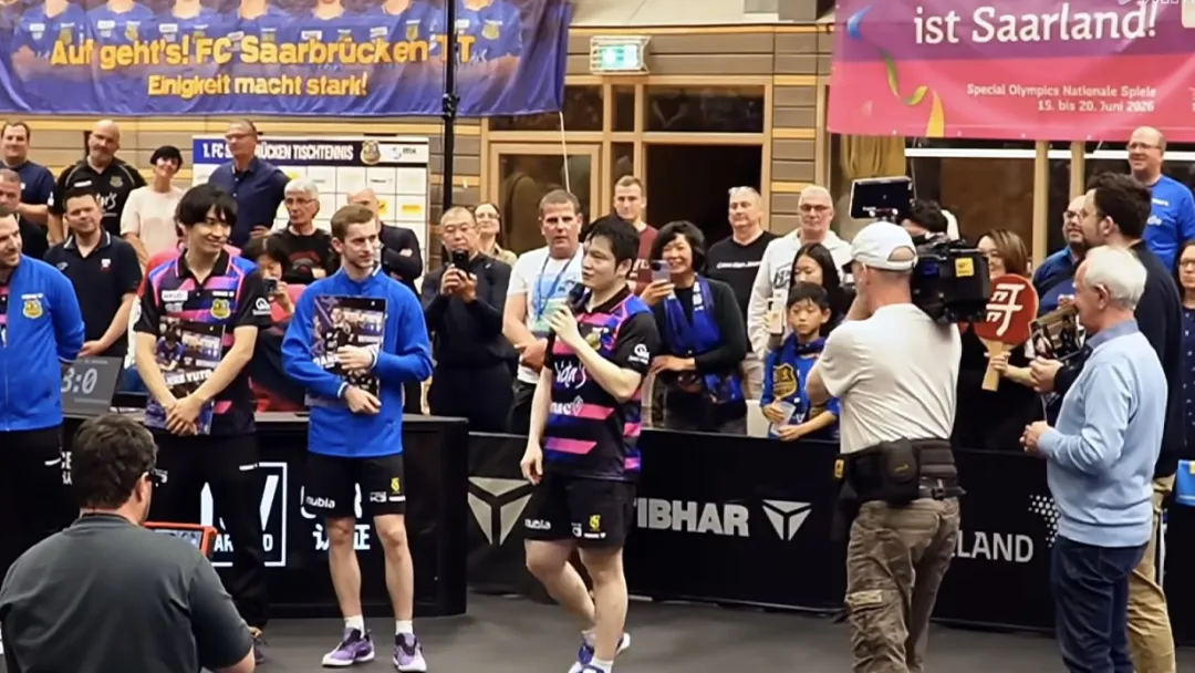 4月16日,2025-2026赛季德甲乒乓球联赛第二十一轮迎来一场焦点战,萨尔布吕肯主场迎战云达不来梅。樊振东独拿2分,带领球队以3:1战胜对手。赛后,球队为樊振东等四位离队球员举办了温馨的主场告别仪式。