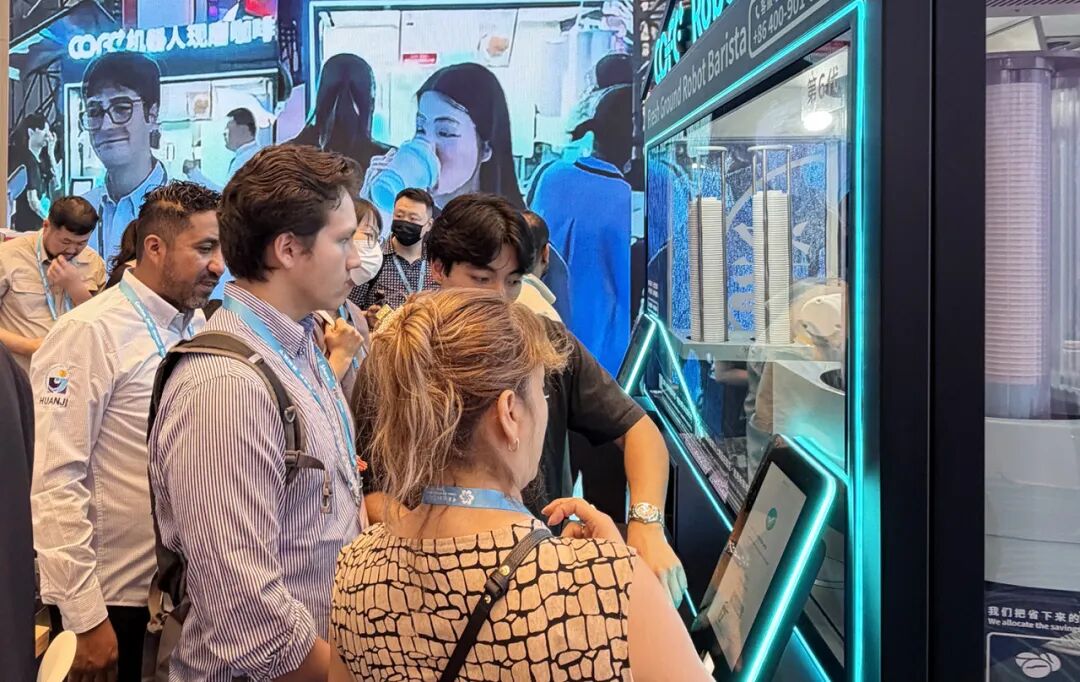 一杯8盎司的卡布奇诺从下单到完成平均仅需43秒,全品类饮品平均用时在30秒至1分钟左右。广交会现场,“cofe+”机器人咖啡馆制作咖啡的速度引来不少参展商驻足围观,据工作人员介绍,该产品日产咖啡量超千杯,与人类咖啡师相比,机器人有着几乎零误差、零失误的优势。