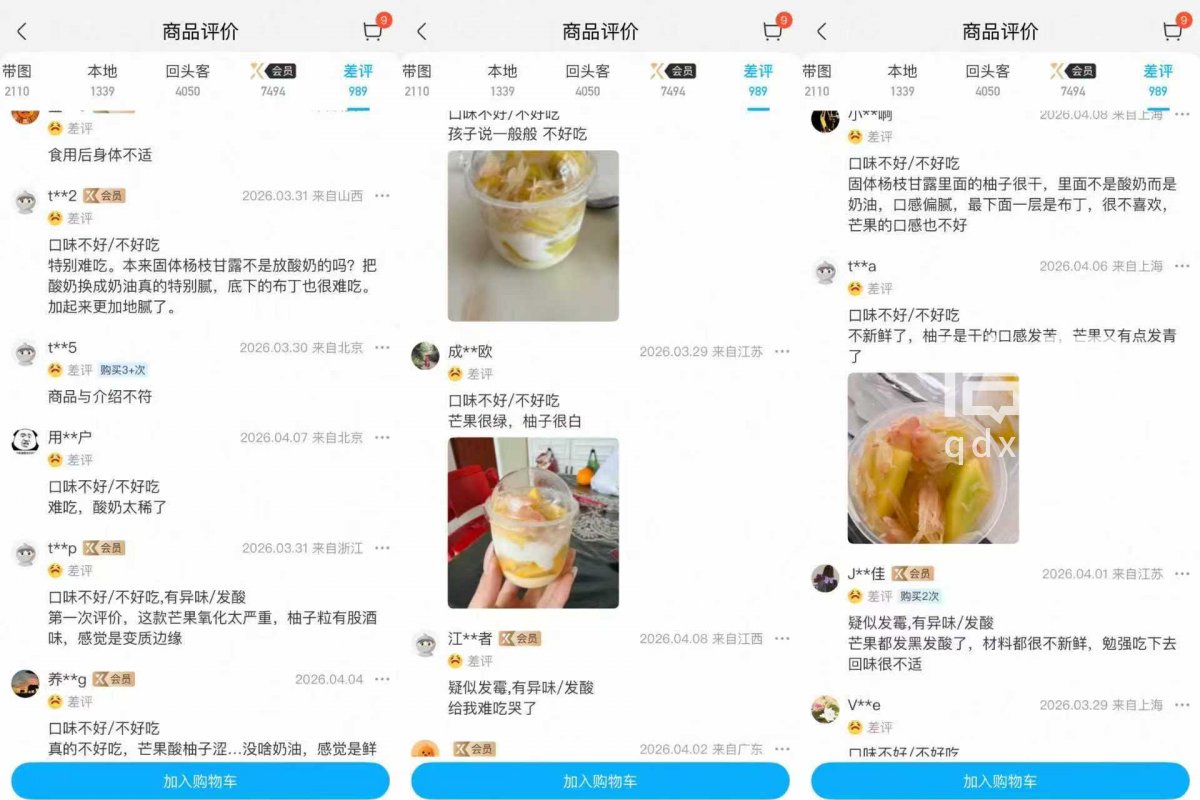 信号新闻注意到,该产品在盒马App上的评价多达3万余条,其中差评有989条,有一些网友反映,里面的芒果发黑发青,甚至发酸。还有网友反馈柚子发苦,有酒味,疑似产品变质。