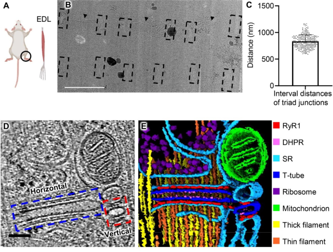 图1.小鼠骨骼肌中天然三联体连接的整体结构(A)从小鼠腿部手动提取的伸趾长肌纤维,黑色圆圈标示提取位置。(B)小鼠骨骼肌冷冻薄片的低倍冷冻电镜图像。规则排列的三联体连接由黑色虚线框标出,三联体连接附近的线粒体以黑色三角形标示。比例尺:1 μm。(C)三联体连接间隔距离的分布情况。(样本数277,均值833 nm,标准差122 nm。)(D)代表性断层切片显示两个垂直排列的三联体连接及其周围环境。比例尺:100 nm。水平与垂直方向的三联体连接分别由蓝色和红色虚线框标出。(E)分割后的断层图像展示(D)中三联体连接周围的不同组分。