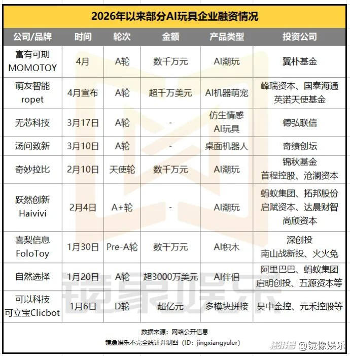 综合企查查、天眼查、Wind等多平台数据,2025年至今,AI玩具公司的相关融资超过50起,累计融资金额超200亿元。尤其是进入2026年,相关融资动作更加频繁,其中,可以科技的D轮融资破亿,由阿里、蚂蚁集团等参与投资的自然选择,新一轮融资金额也达到3000万美元。