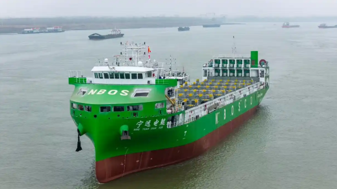 据了解,该船命名为“宁远电鲲”轮,可装载742标准箱货物,配置10个箱式电池约2万度电量作为动力,可实现纯电零排放航行,具备开阔水域自主航行等智能功能。