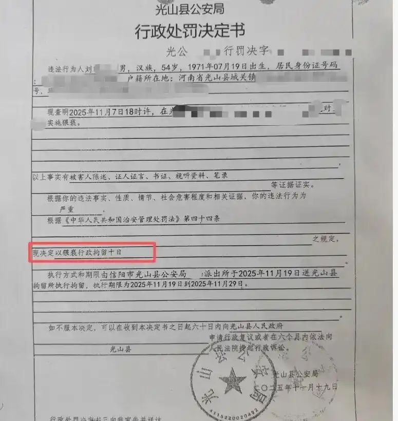 光山县公安局对涉事老师的《行政处罚决定书》。大风新闻图