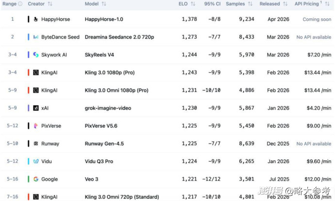4月7日,一个叫HappyHorse-1.0的视频模型空降Artificial Analysis盲测榜单,文生视频、图生视频双双登顶,Elo积分甩开第二名的字节Seedance 2.0超过100分。