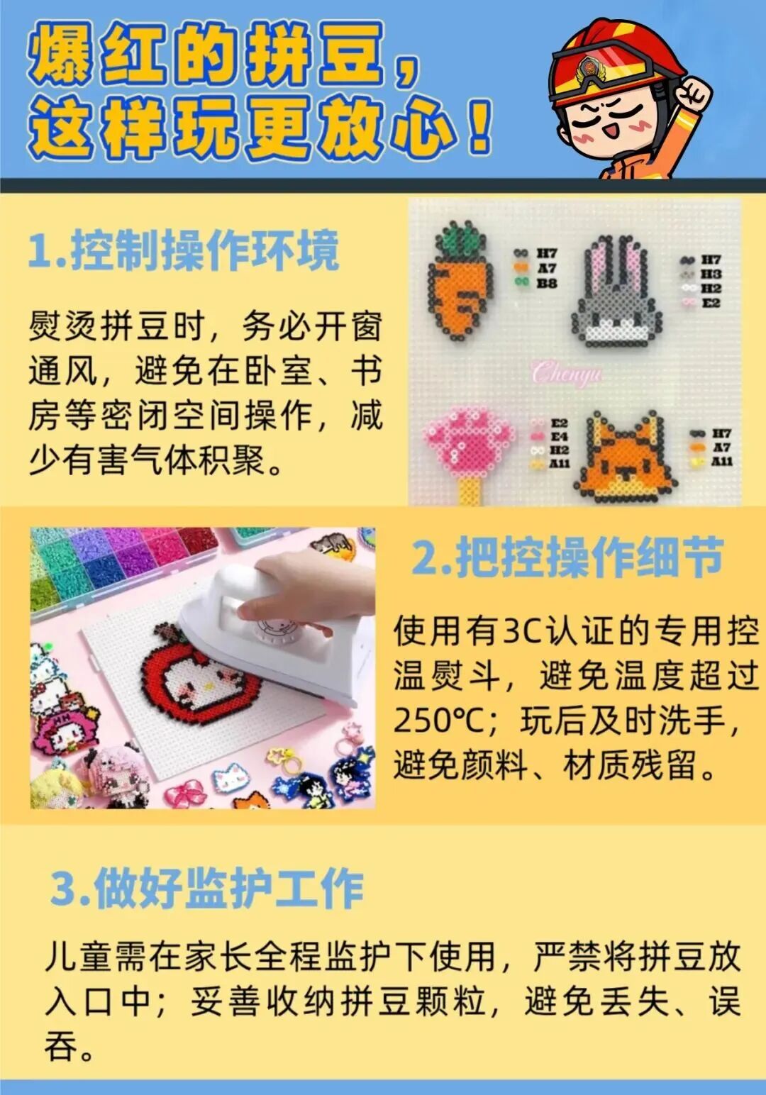 消防员指出,目前市面上部分拼豆套装附带的电熨斗缺少必要的温控保护装置,且电源线绝缘层的耐热性能不足,存在显著的安全隐患。