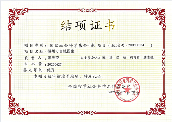 近日,全国哲学社会科学工作办公室公布了2026年2月国家社科基金年度项目结项情况。我校文学院栗华益教授主持的“徽州方言地图集”项目顺利通过结项,最终成果《徽州方言调查报告》获“优秀”等级。